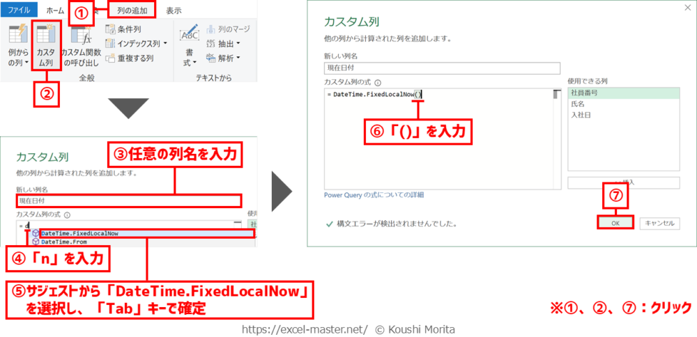 年齢や入社年数等を計算したい場合、現在の日付/時刻も必要ですが、Power Queryエディターには、現在の日付/時刻を取得するためのコマンドがありません。