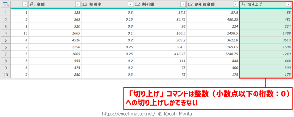 通常、クエリ内の一連の整形作業の中で、切り上げを行いたい場合、Power Queryエディター上の「切り上げ」コマンドを使います。