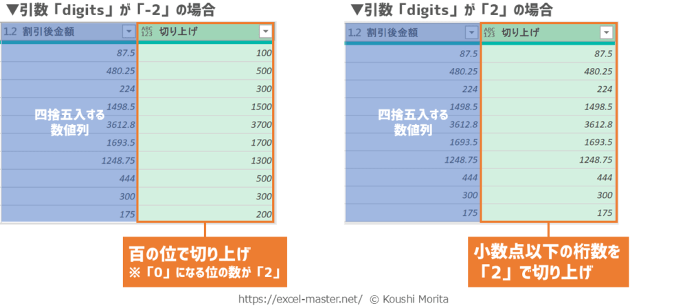 必要に応じ、Microsoft Learnの「Number.RoundUp」の記事もご参照ください。