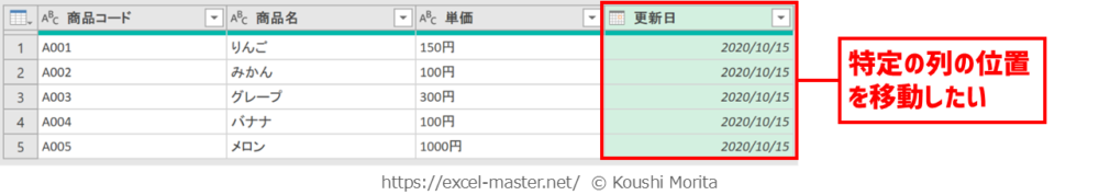クエリ内の一連の整形作業の中で、特定の列の位置を移動したい場合に「移動」コマンドを使いましょう。