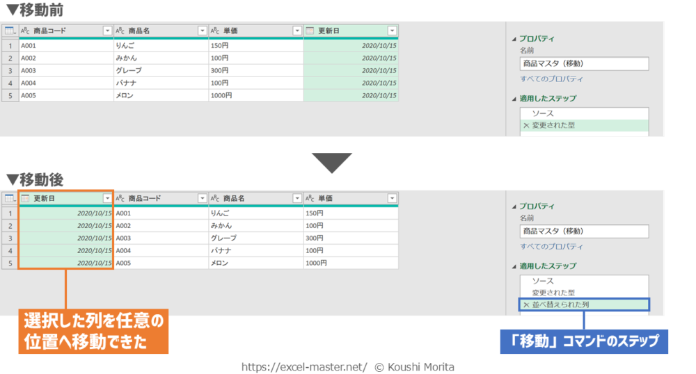 「移動」コマンドのステップ登録後、移動対象の列名を変更すると、クエリ更新時にエラーになるため注意(対処法は、後述の「登録したステップの変更手順」を参照)。