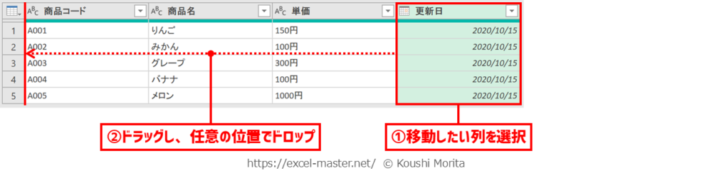 ※今回は「更新日」列 - ドラッグし、任意の位置でドロップ