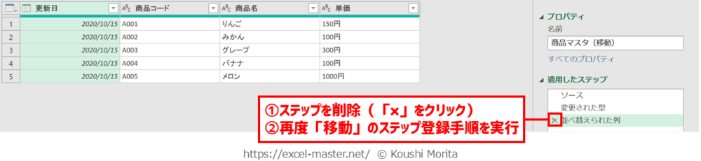 ブックを開いたら、「商品マスタ(移動)」クエリを編集(Power Queryエディター起動)し、次の手順を実施してください(今までの解説のまとめです)。