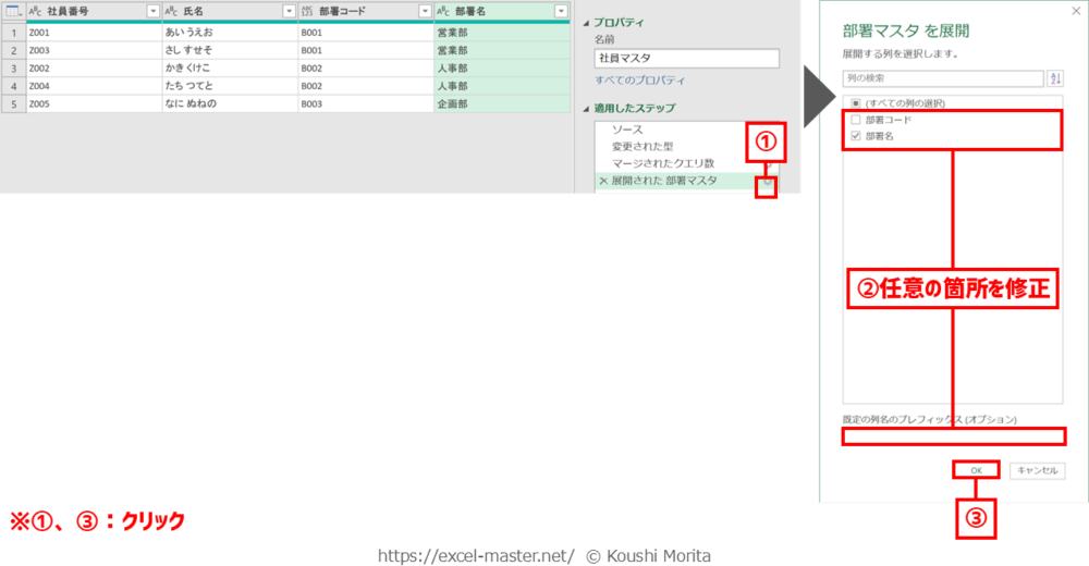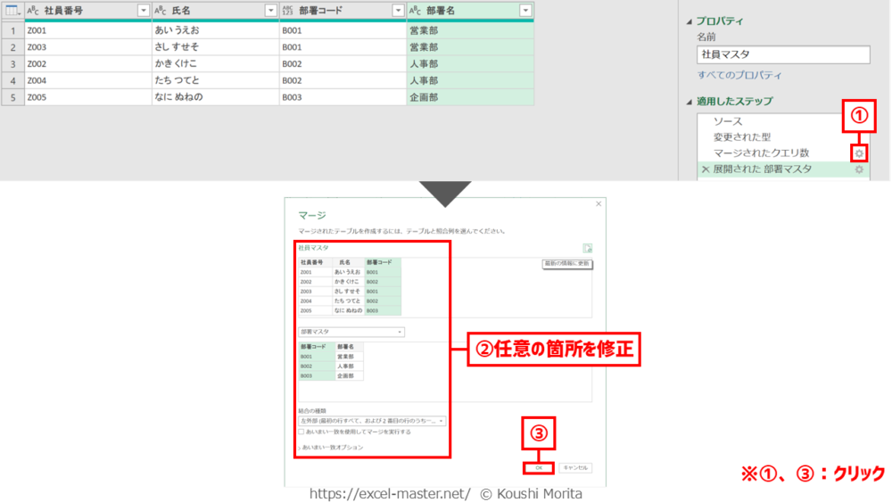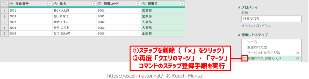 ブックを開いたら、「社員マスタ」クエリを編集(Power Queryエディター起動)し、次の手順を実施してください(今までの解説のまとめです)。