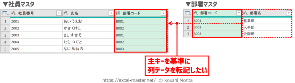 社員マスタへ別表の部署マスタの「部署名」列を転記したいです。