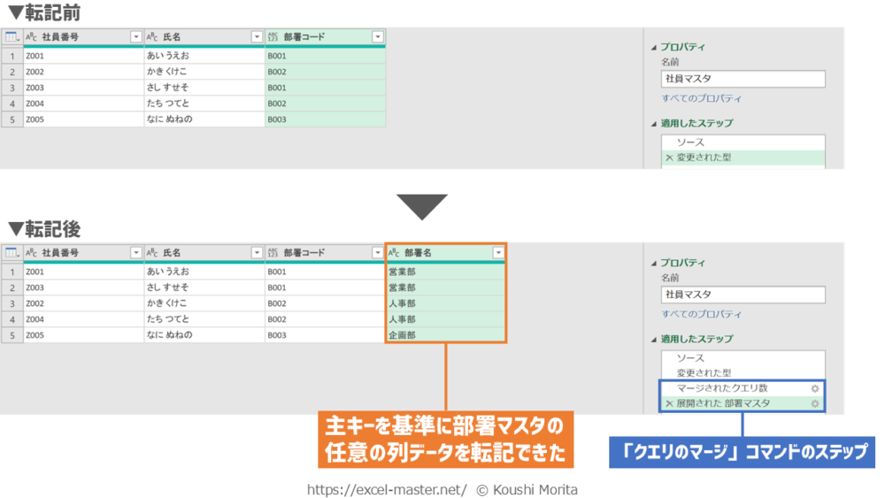 「クエリのマージ」コマンドで社員マスタへ部署マスタの「部署名」列を転記したイメージが以下です。