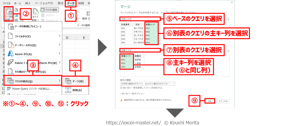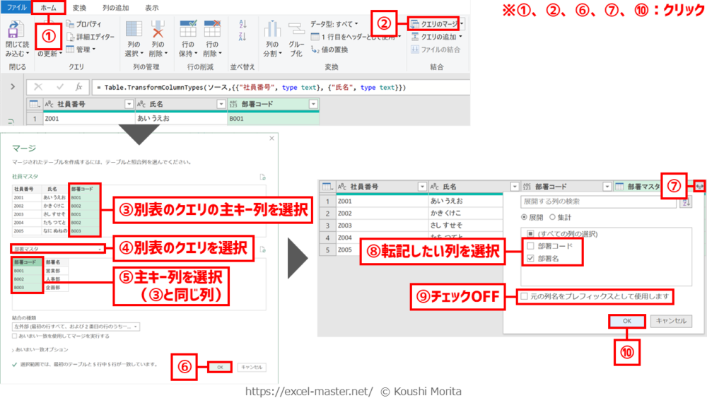 手順②は、「クエリのマージ」コマンドならステップ登録手順⑦以降、「マージ」コマンドならステップ登録手順⑩以降を実行。