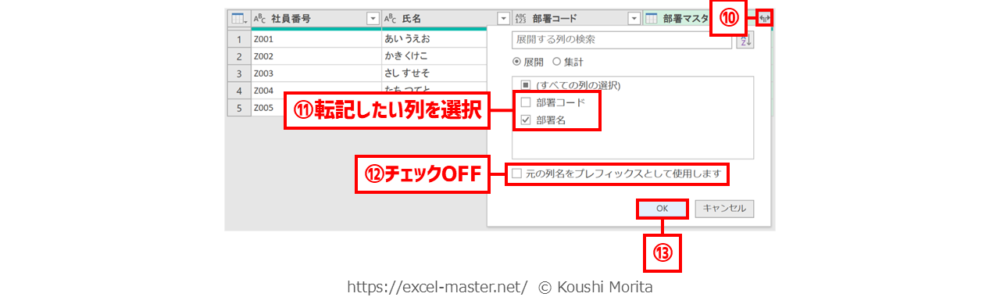 ※今回は「部署マスタ」クエリ - 主キー列(手順③と同じ列)を選択