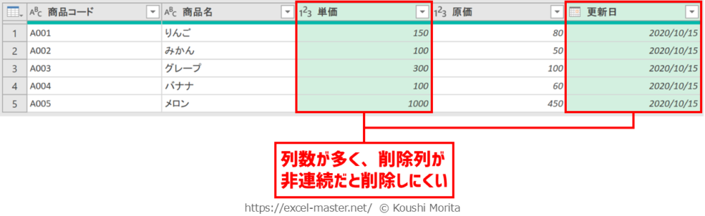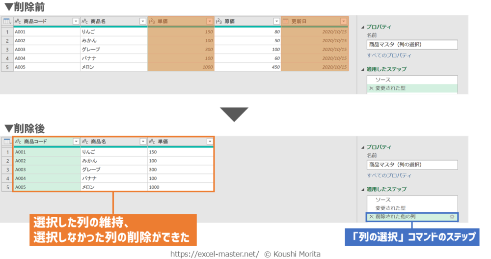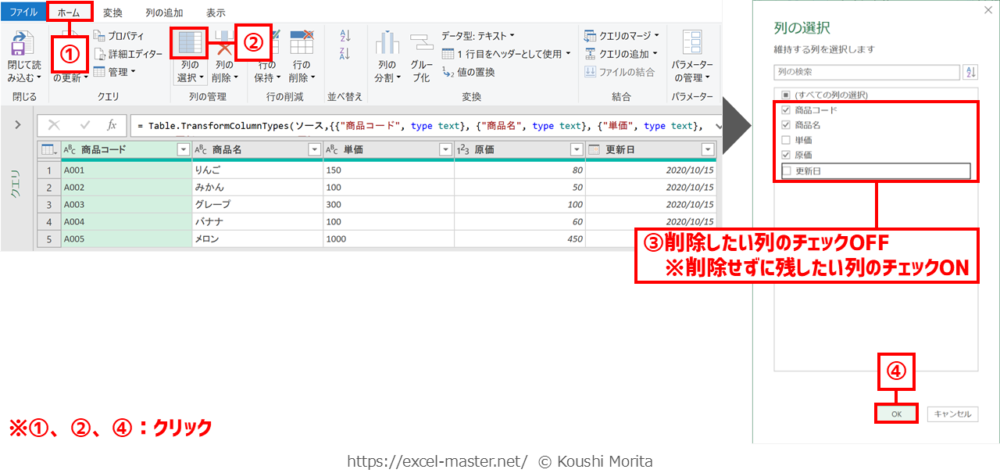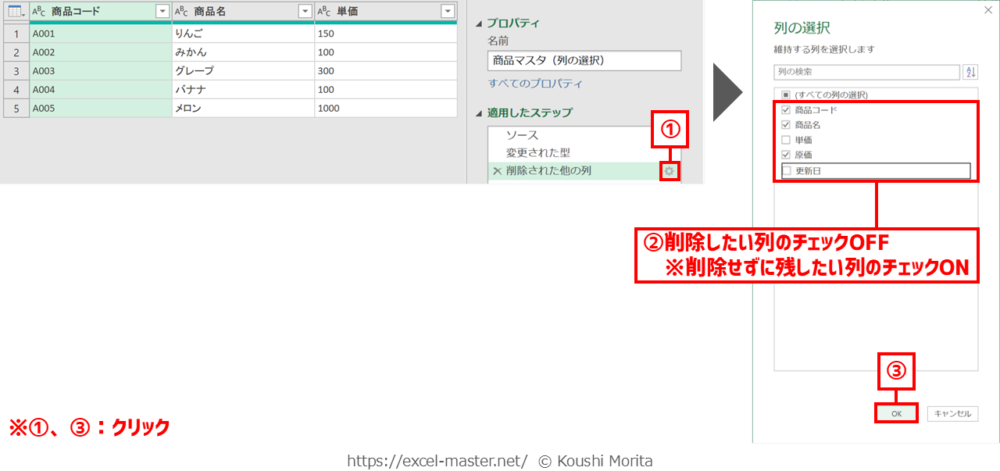 ブックを開いたら、「商品マスタ(列の選択)」クエリを編集(Power Queryエディター起動)し、次の手順を実施してください(今までの解説のまとめです)。