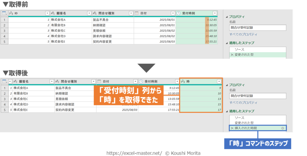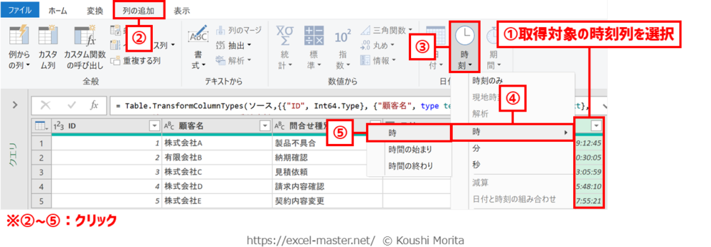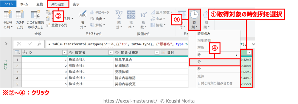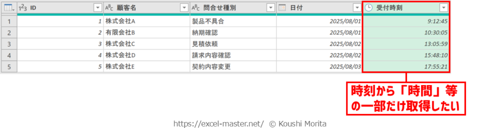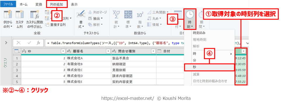 クエリ内の一連の整形作業の中で、時刻列の一部を取得したい場合に「時」・「分」・「秒」コマンドを使いましょう。