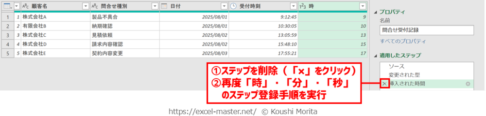 ブックを開いたら、「問合せ受付記録」クエリを編集(Power Queryエディター起動)し、次の手順を実施してください(今までの解説のまとめです)。