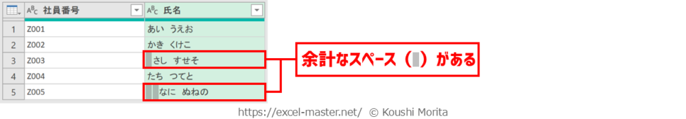 「氏名」列を対象に「トリミング」コマンドを使用し、スペースを削除したイメージが以下です。