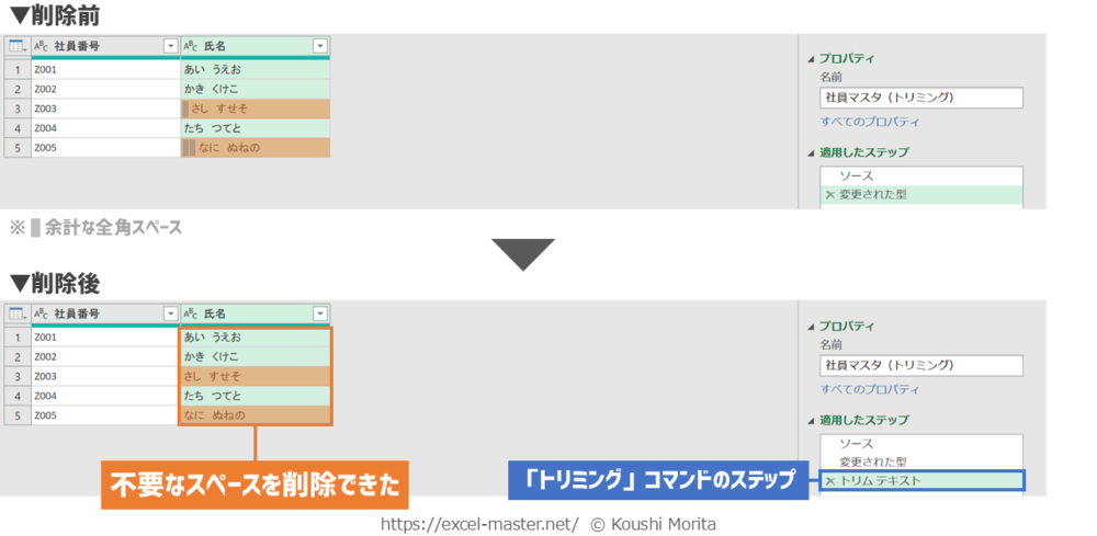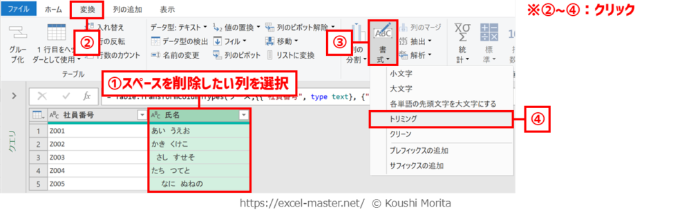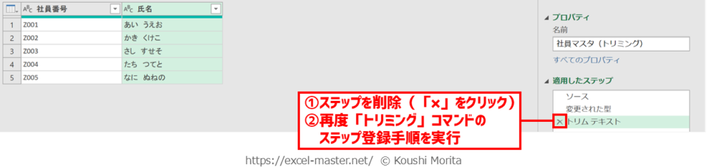 ブックを開いたら、「社員マスタ(トリミング)」クエリを編集(Power Queryエディター起動)し、次の手順を実施してください(今までの解説のまとめです)。