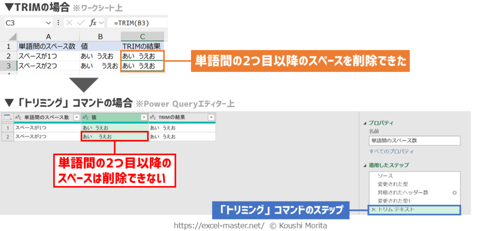 「トリミング」コマンドとワークシート関数のTRIMとの違いは、スペースの削除範囲です(「トリミング」コマンドの方が狭い)。