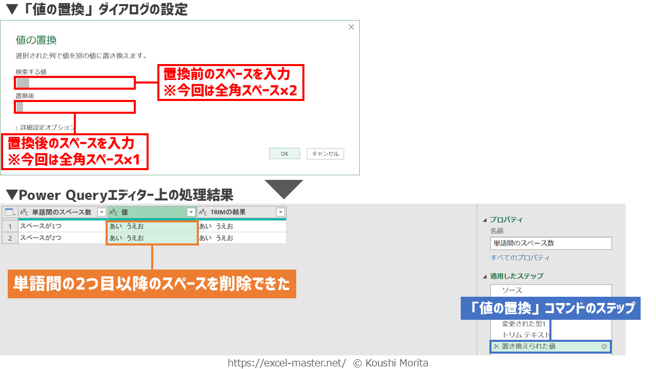 Power Queryエディター上でスペースを削除したステップを登録できました。