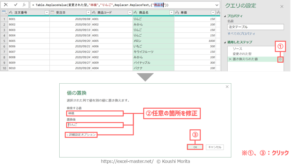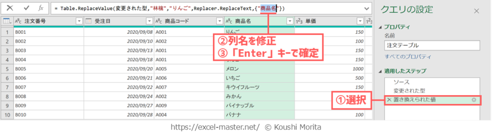 ブックを開いたら、「注文テーブル」クエリを編集(Power Queryエディター起動)し、次の手順を実施してください(今までの解説のまとめです)。