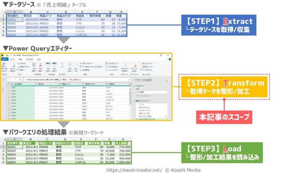 Excelのパワークエリ(Power Query)の概要、できること、基本的な使い方をExcel本著者が初心者向けに解説。データ収集/整形を自動化する流れを豊富な図解でわかりやすく学べます。
