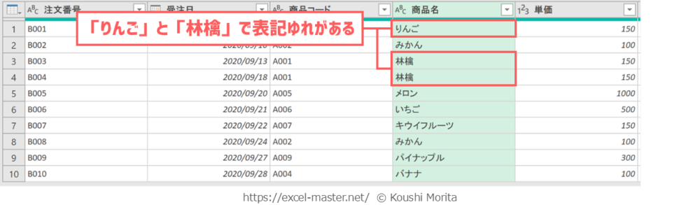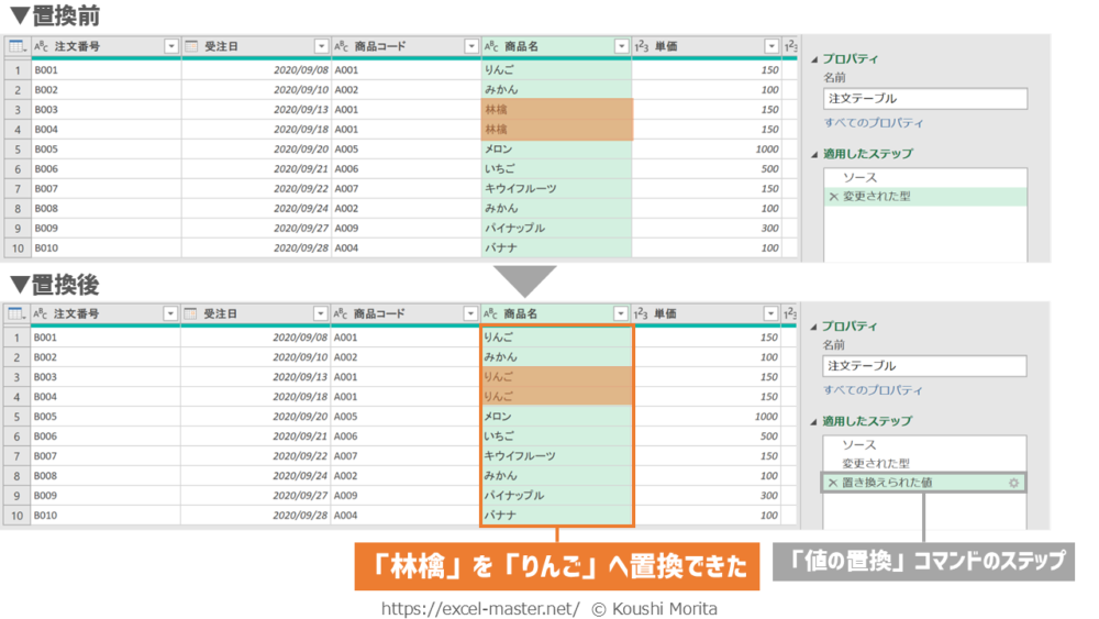 一例として、「商品名」列を対象に「値の置換」コマンドで「林檎」を「りんご」へ置換したものが以下です。