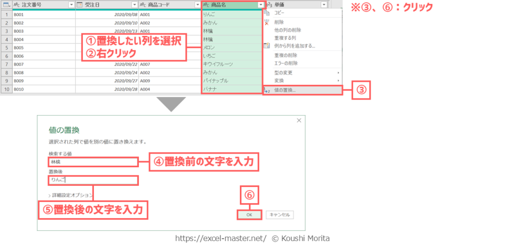 「値の置換」コマンドとは、Power Queryエディター上で列内の値を新しい値へ置換する機能