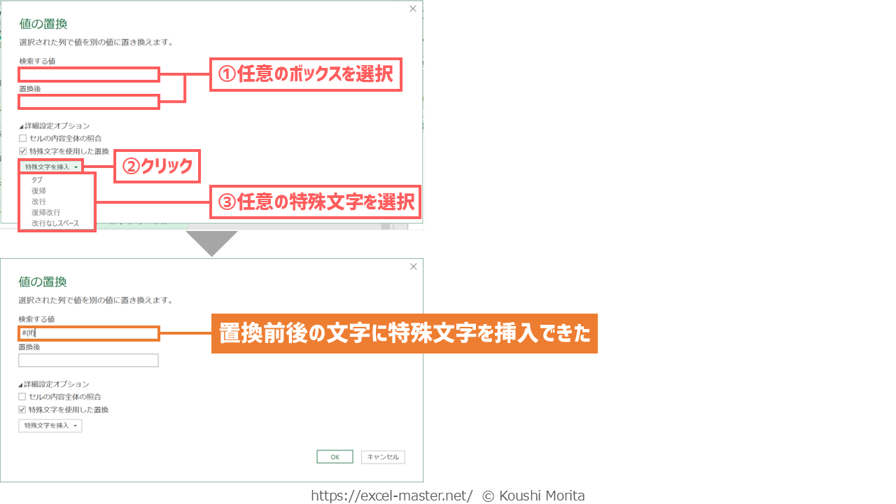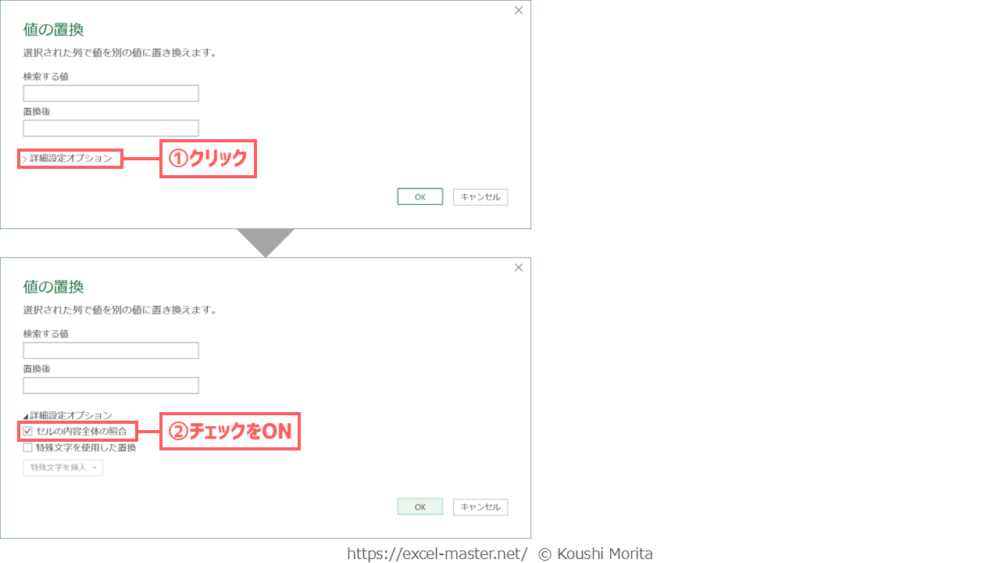 実際にこの設定を行う場合、「値の置換」ダイアログを開いたら、前述の手順⑥の前に以下手順を行ってください。