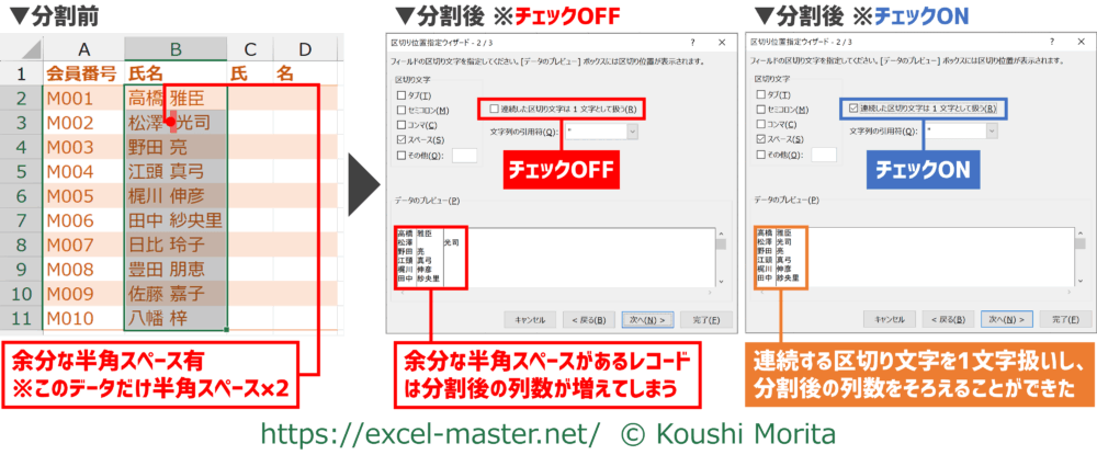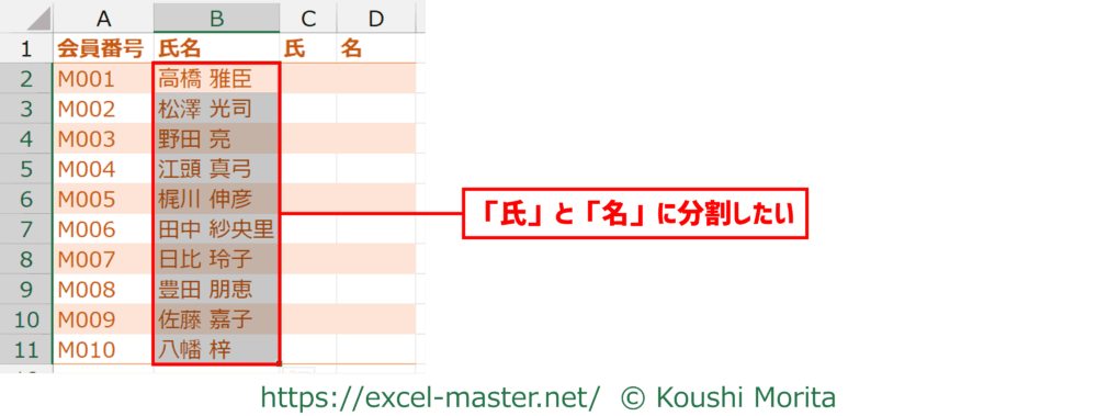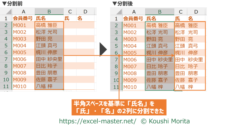 上記では、分割前の「氏名」の列も残していますが、分割後の「氏」・「名」の列で上書きして残さないことも可能です。