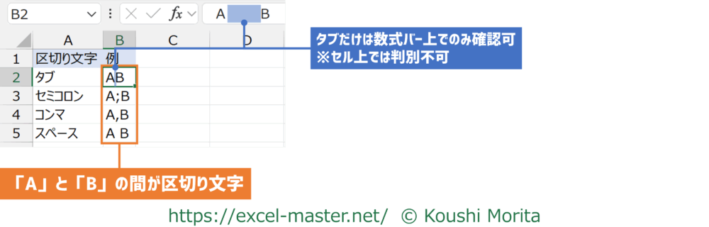 「区切り位置指定ウィザード – 2 / 3」の規定の選択肢になっている区切り文字は以下の4種類です(以下「例」の列の「A」と「B」の間が区切り文字)。
