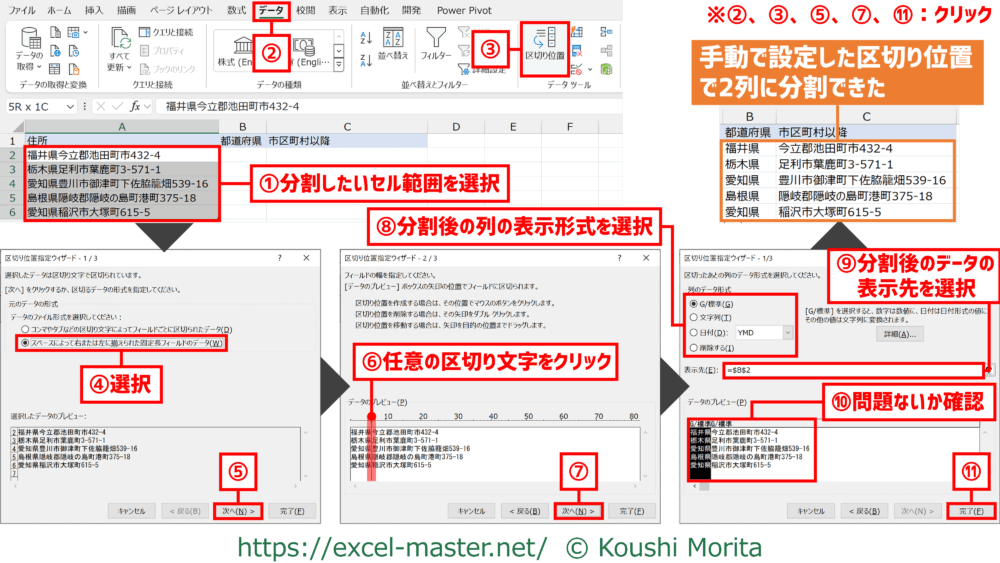手順⑥⑩で問題がある場合は、「区切り位置指定ウィザード」の設定を見直すか、分割前のデータ側に他のデータクレンジング作業を行うこと。