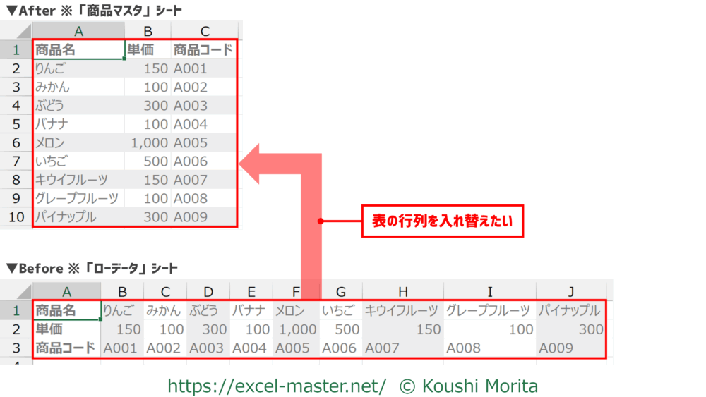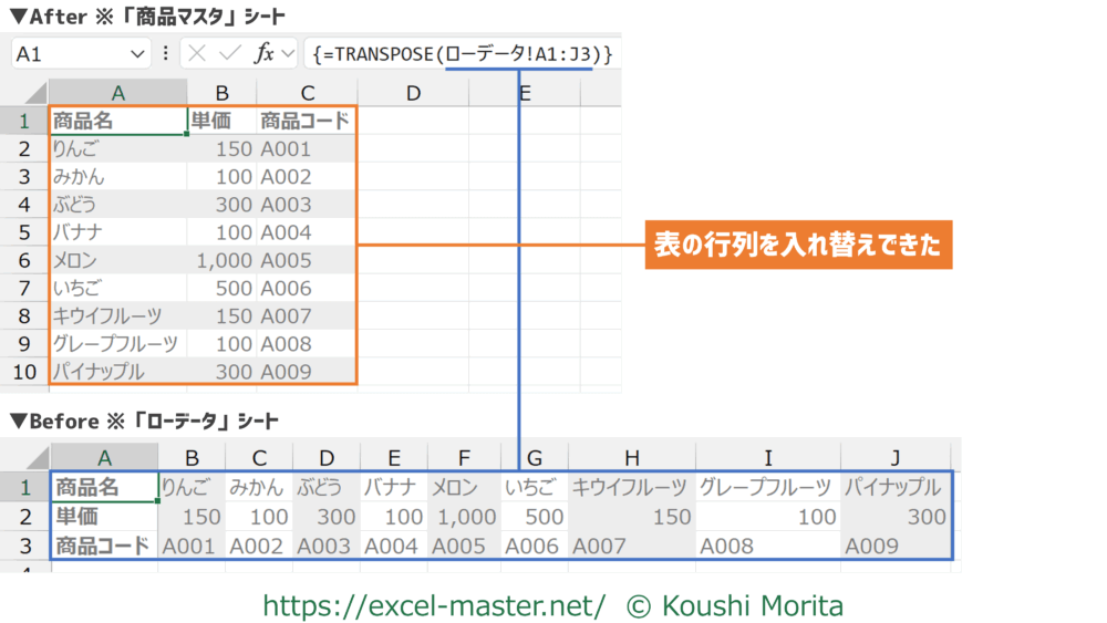 今回は「ローデータ」シートのA1~J3セルの表を対象に、行列を入れ替えた結果を「商品マスタ」シートのA1~C10セルへ返しました。