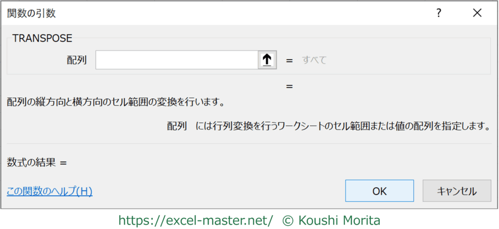 | 配列 | ○ | すべて | 行列を入れ替えたいセル範囲を指定します。 |