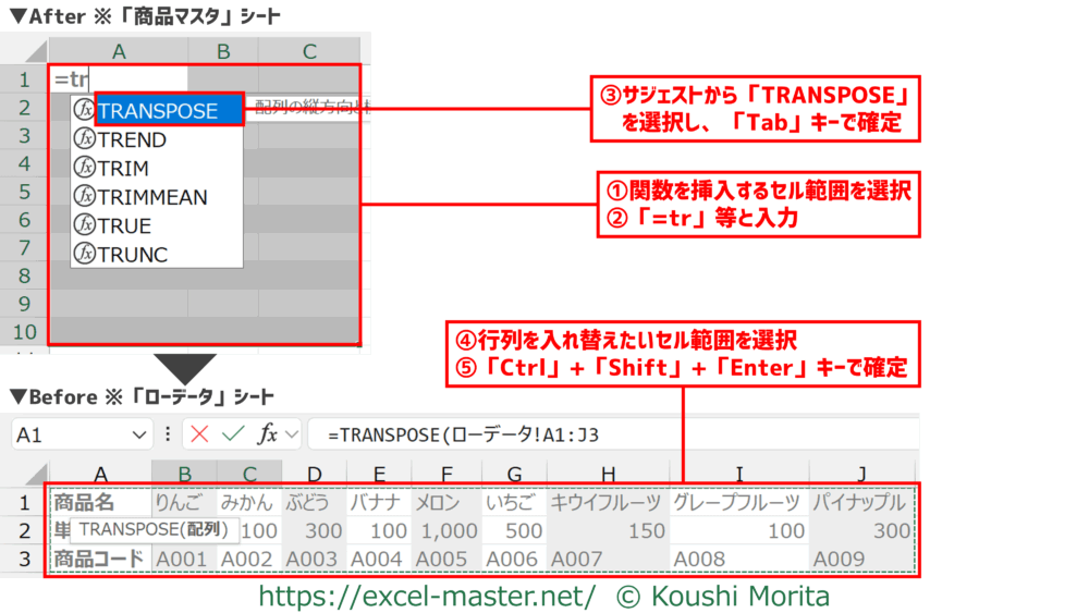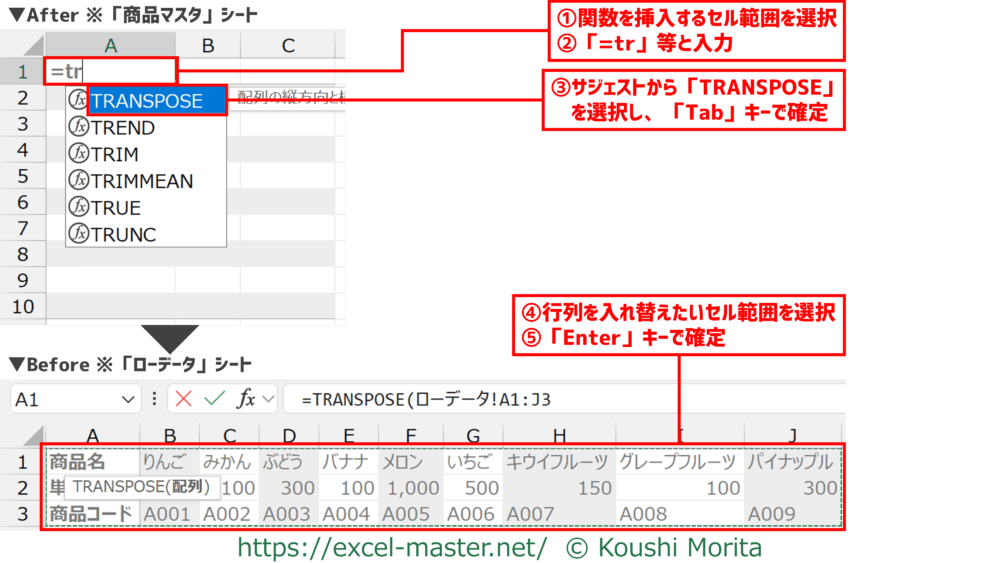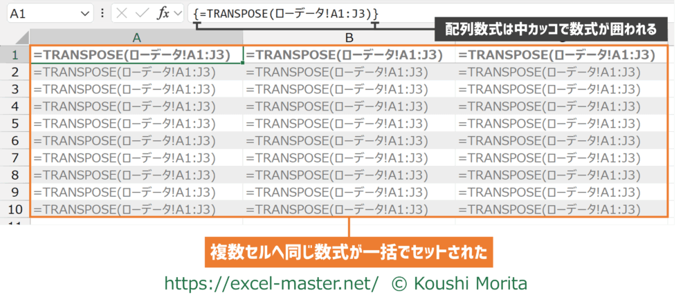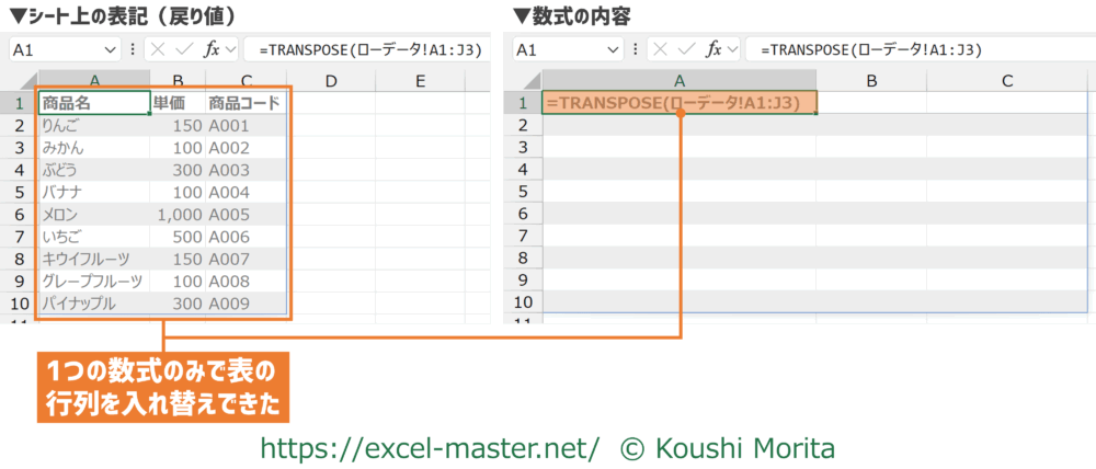 ちなみに、TRANSPOSE をセットした「商品マスタ」シートのA1~C10セルには、すべて同じ数式を一括でセットする「配列数式」という数式で使うことが一般的です。