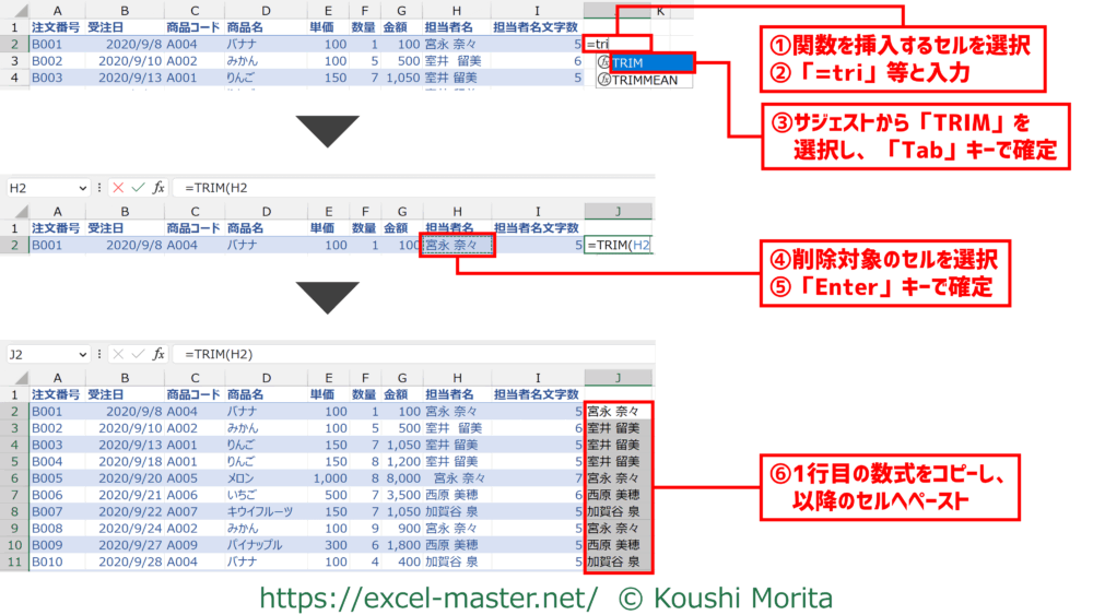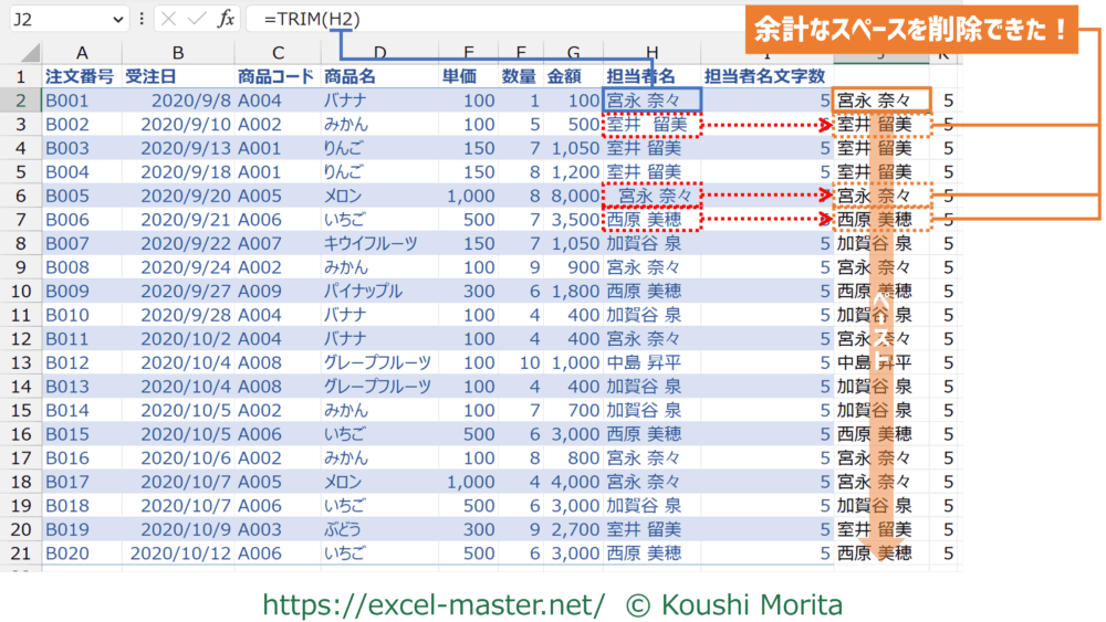その場合は、関数の「TRIM」を活用すると良いですよ!