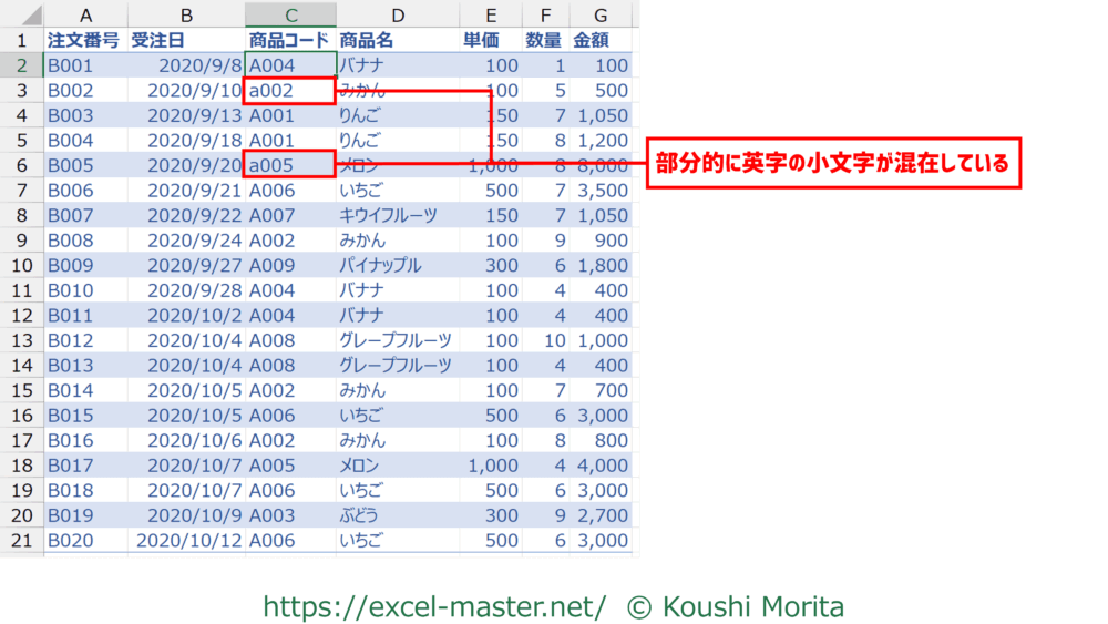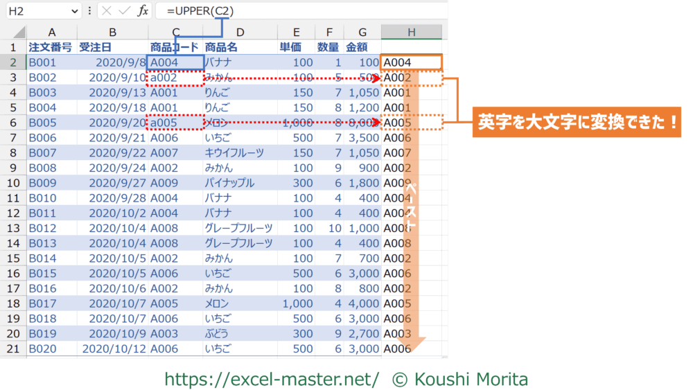 今回は「商品コード」列の英字を大文字へ変換しました。