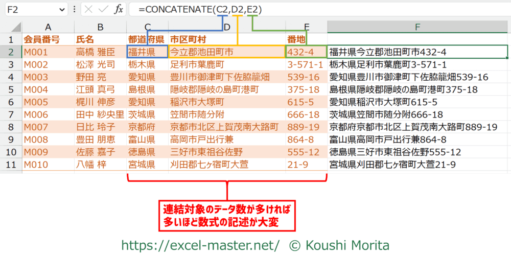 「都道府県」と「市区町村」、「番地」など、複数データの連結を「&」やCONCATENATEで設定するのがやや面倒です。。
