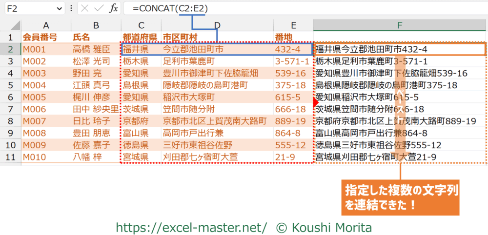 この場合、セル範囲で連結対象のデータを指定できる関数の「CONCAT」を使うと良いです。