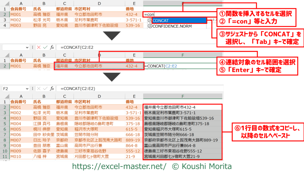 ※今回はF2セル - 「=con」等と入力