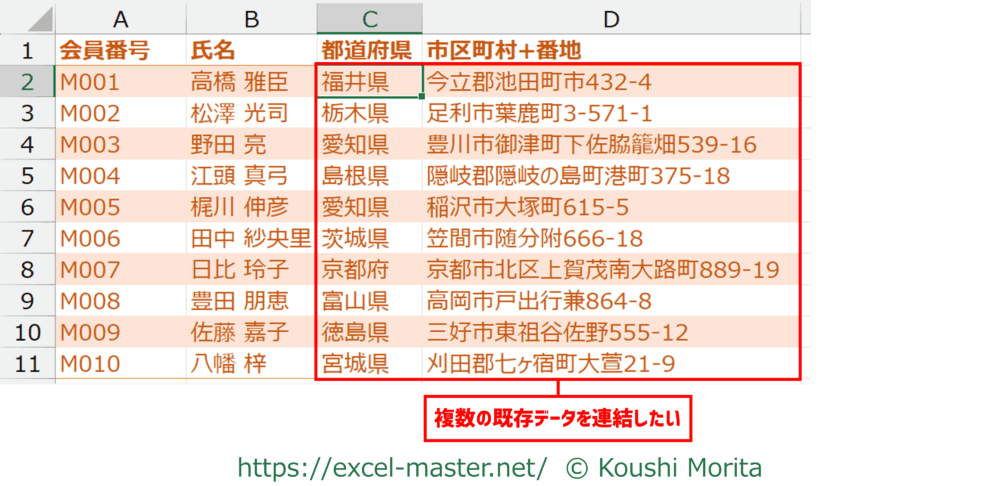 たとえば、「都道府県」と「市区町村+番地」のように、列を分けて管理されているものを一つにまとめたいといったイメージです。