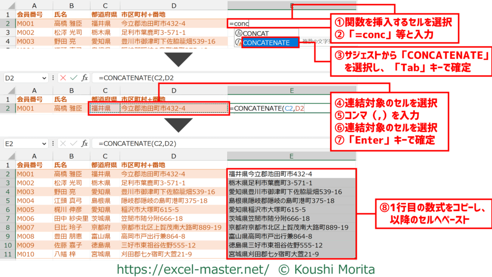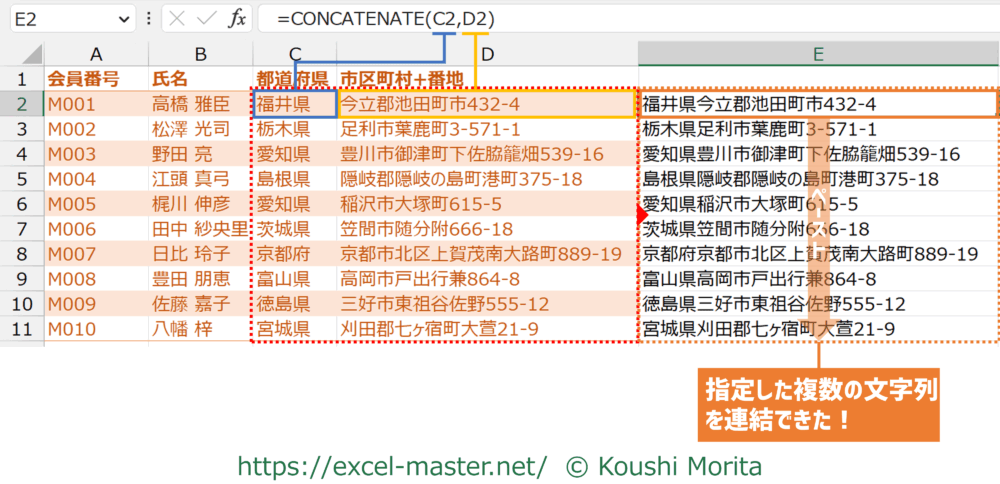 今回は「都道府県」列と「市区町村+番地」列の各文字列を連結しました。