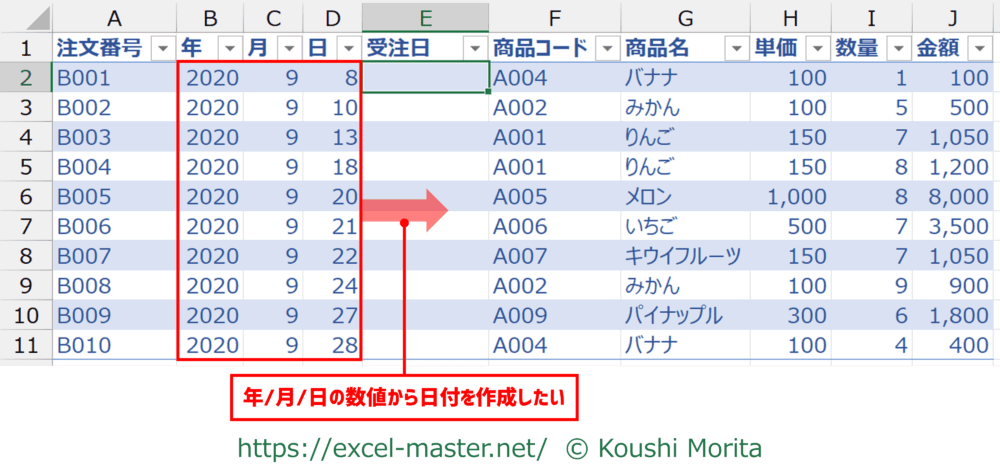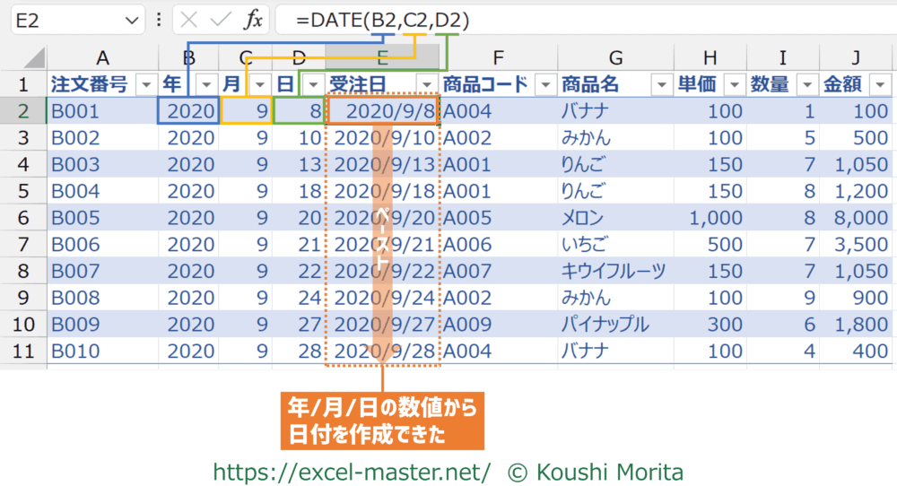 今回は「年」・「月」・「日」の3列のデータから「受注日」列を作成しました。