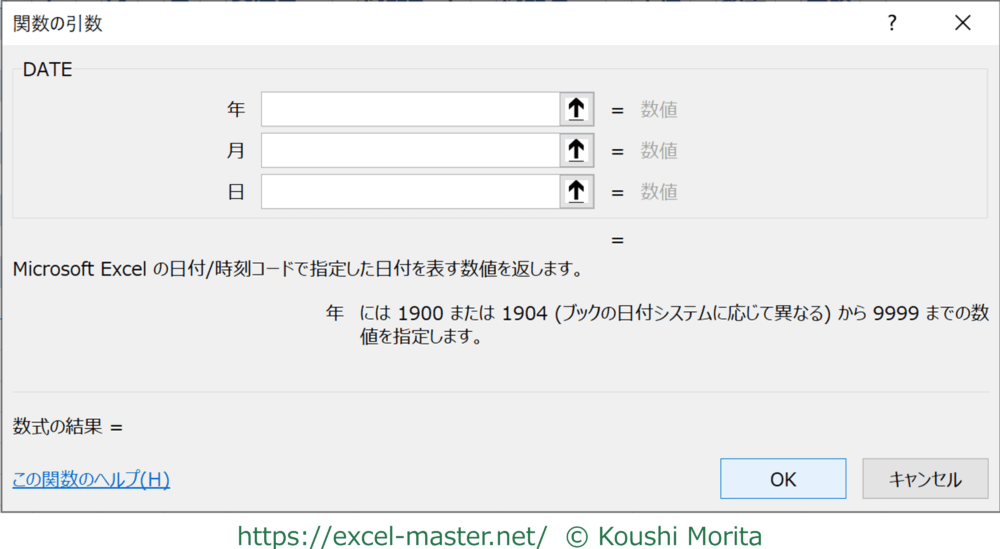 | 日 | ○ | 数値 | 「年」にしたい値や単一セルを指定します。 ※1~31の整数を指定 |