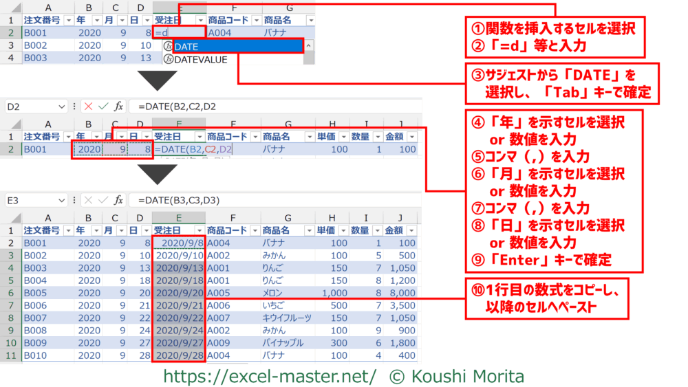 DATEを使い、「日付」を作成するイメージは以下の通りです。