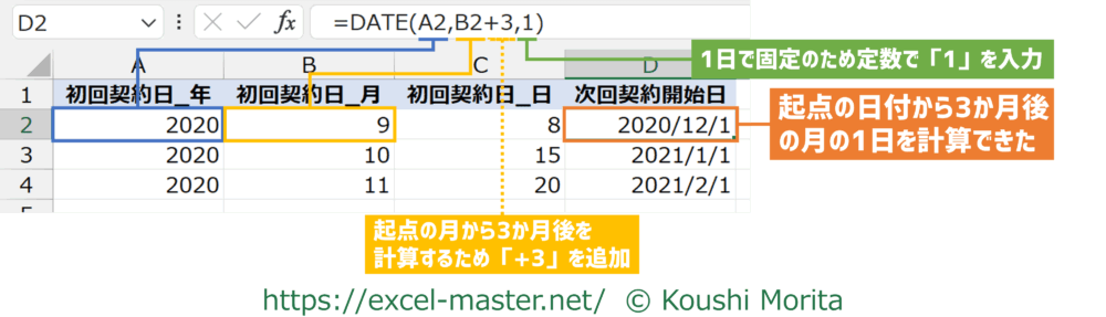 DATEは年/月/日すべてセル参照をする以外にも、それぞれの引数に四則演算や定数を組み合わせることで、任意の日付計算が可能です。