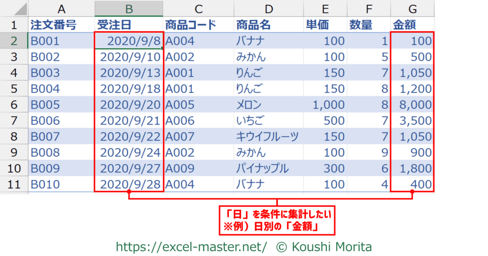 この日付の中の「日」を集計条件にしたい場合、関数で集計するにはハードルが高いです。