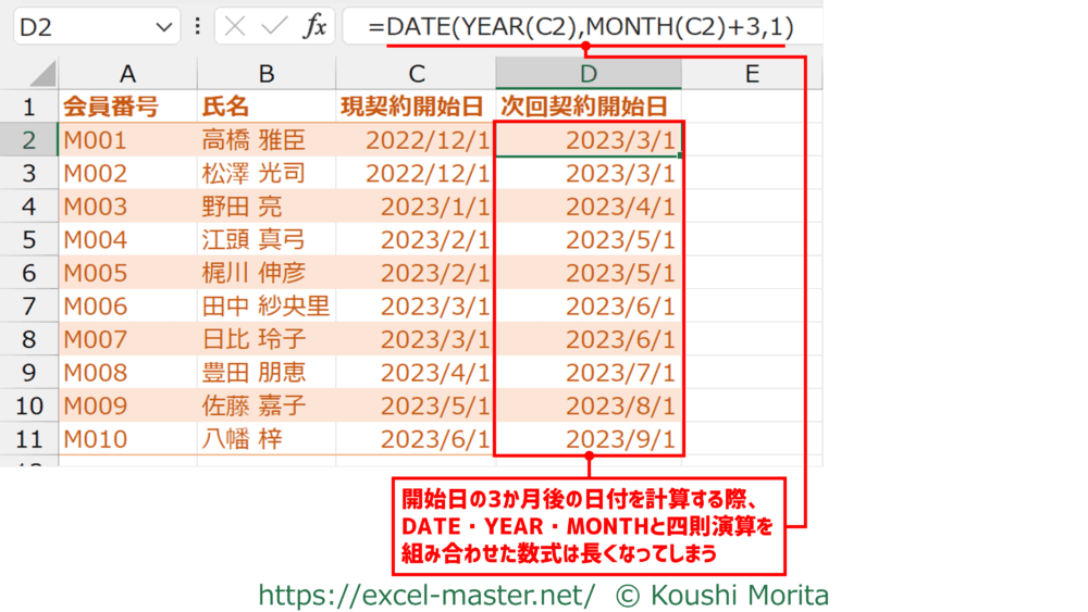 こんな場合、関数の「EDATE」を使うとシンプルな数式で同じ結果を得ることが可能です。