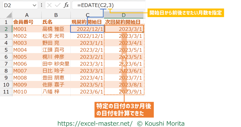 今回は「現契約開始日」列から3か月後の日付を計算しました。