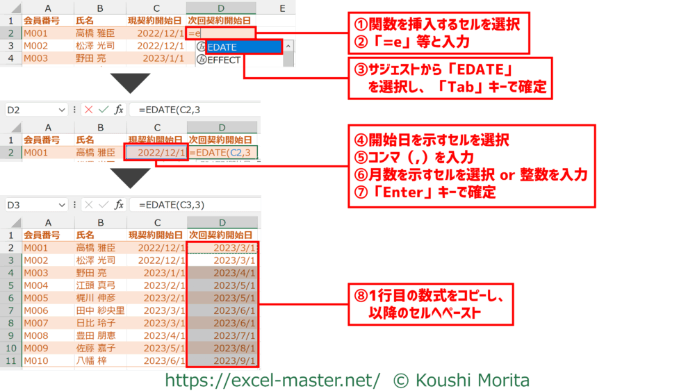 - サジェストから「EDATE」を選択し、「Tab」キーで確定