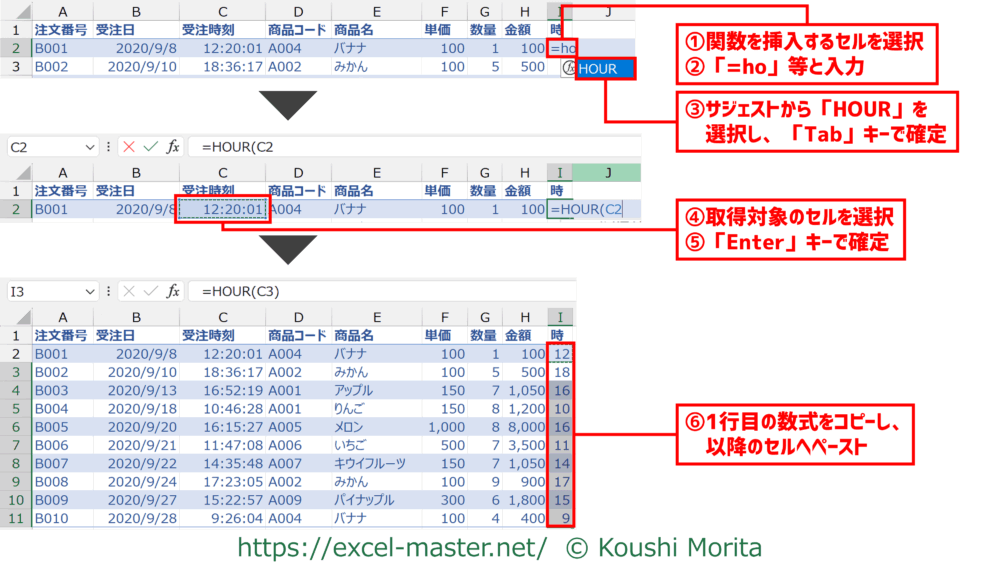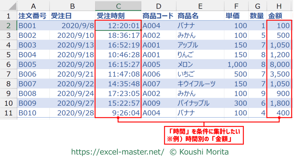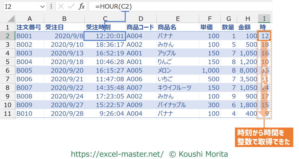 今回は「受注時刻」列のデータから「時間」を取得しました。