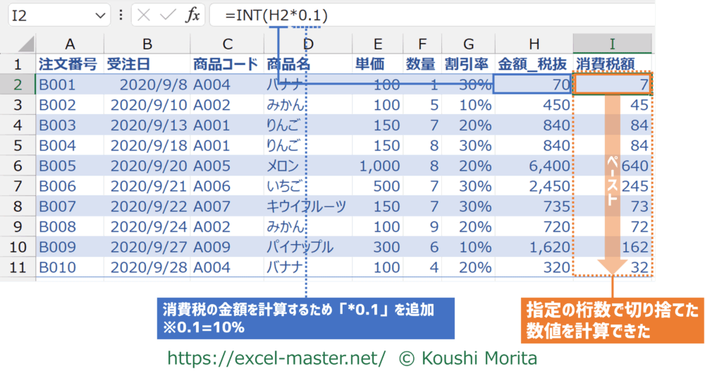 今回は「金額_税抜」列×「0.1(10%)」の結果を整数で切り捨てました。