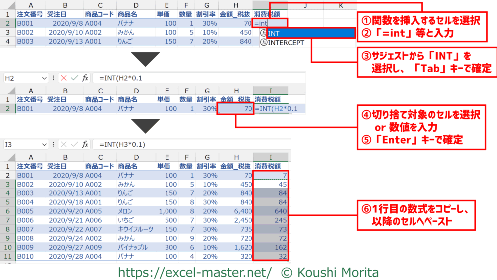 INTを使うことで、対象の数値データを整数に切り捨てできます。