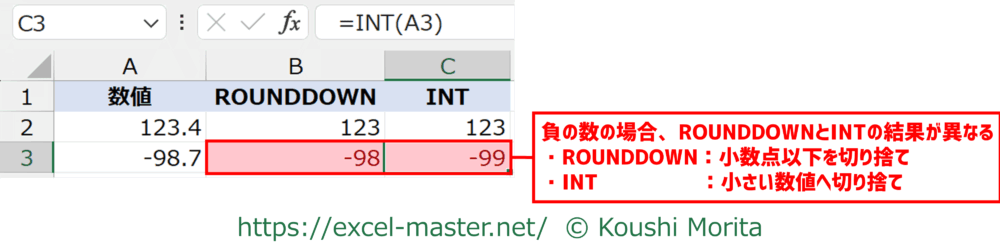 理由としては、純粋に小数点以下を切り捨てるROUNDDOWNに対し、INTは常に小さい数値へ切り捨てるという仕様の違いがあるためです。