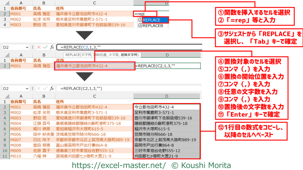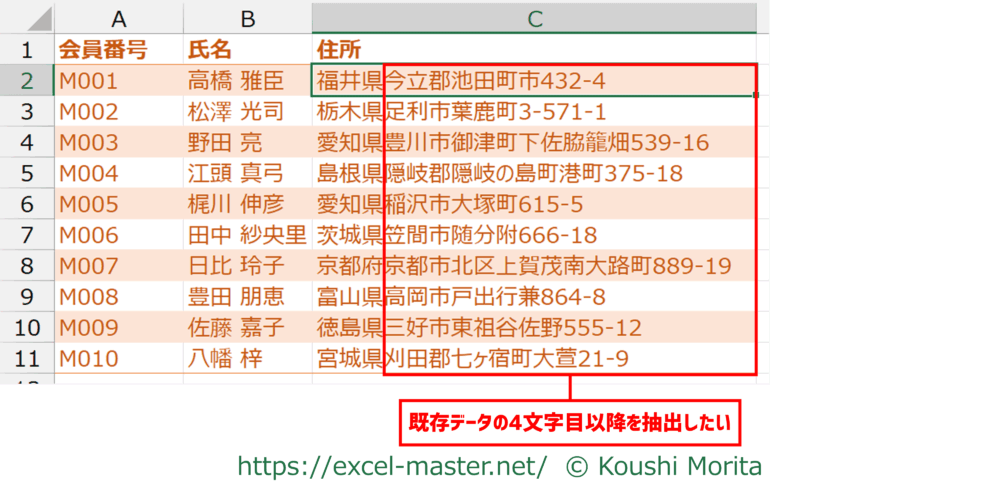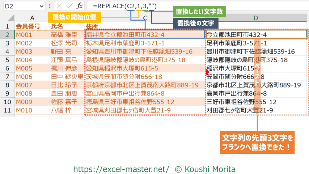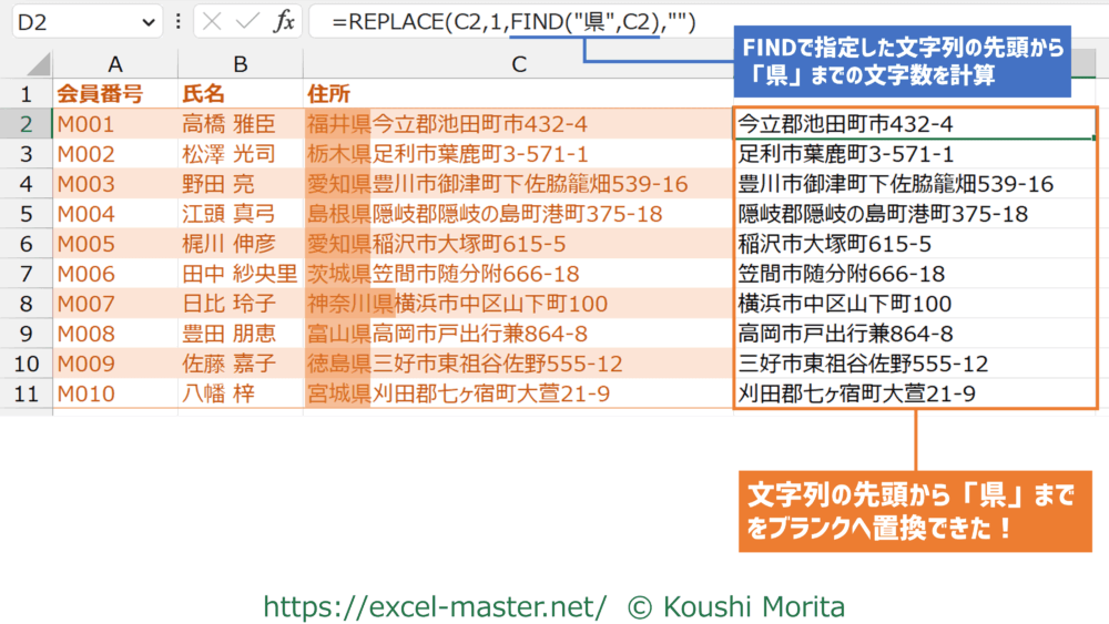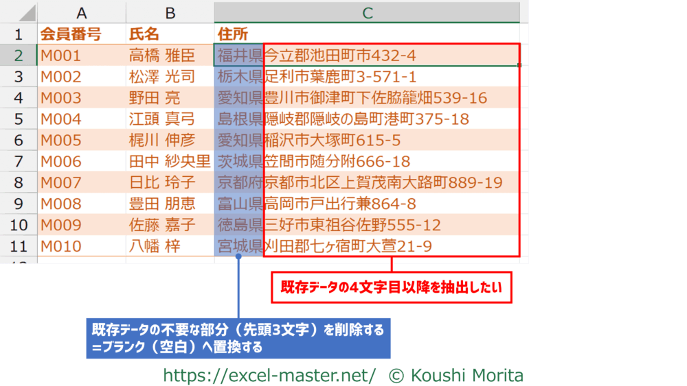 今回は「住所」列のデータの先頭3文字をブランクへ置換し、「市区町村+番地」の文字列を抽出しました。